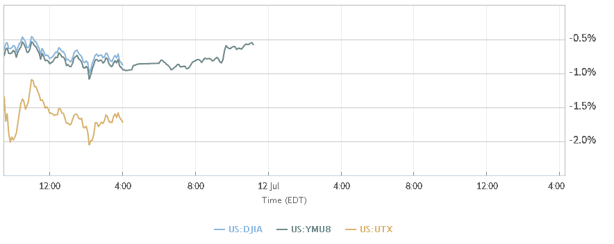 Dow futures YMU8, +0.37% slid 164 points. The biggest Dow decliner was United Technologies Corp.’s stock UTX, -1.72% which fell 2.4%, followed by the 1.2% decline in both McDonald’s Corp. MCD, -1.25% shares, and the 1.2% slide in 3M Co.’s stock MMM, -1.89% The most active Dow stock ahead of the open was Apple Inc.’s AAPL, -1.30% which shed 0.8% on volume of over 186,000 shares.