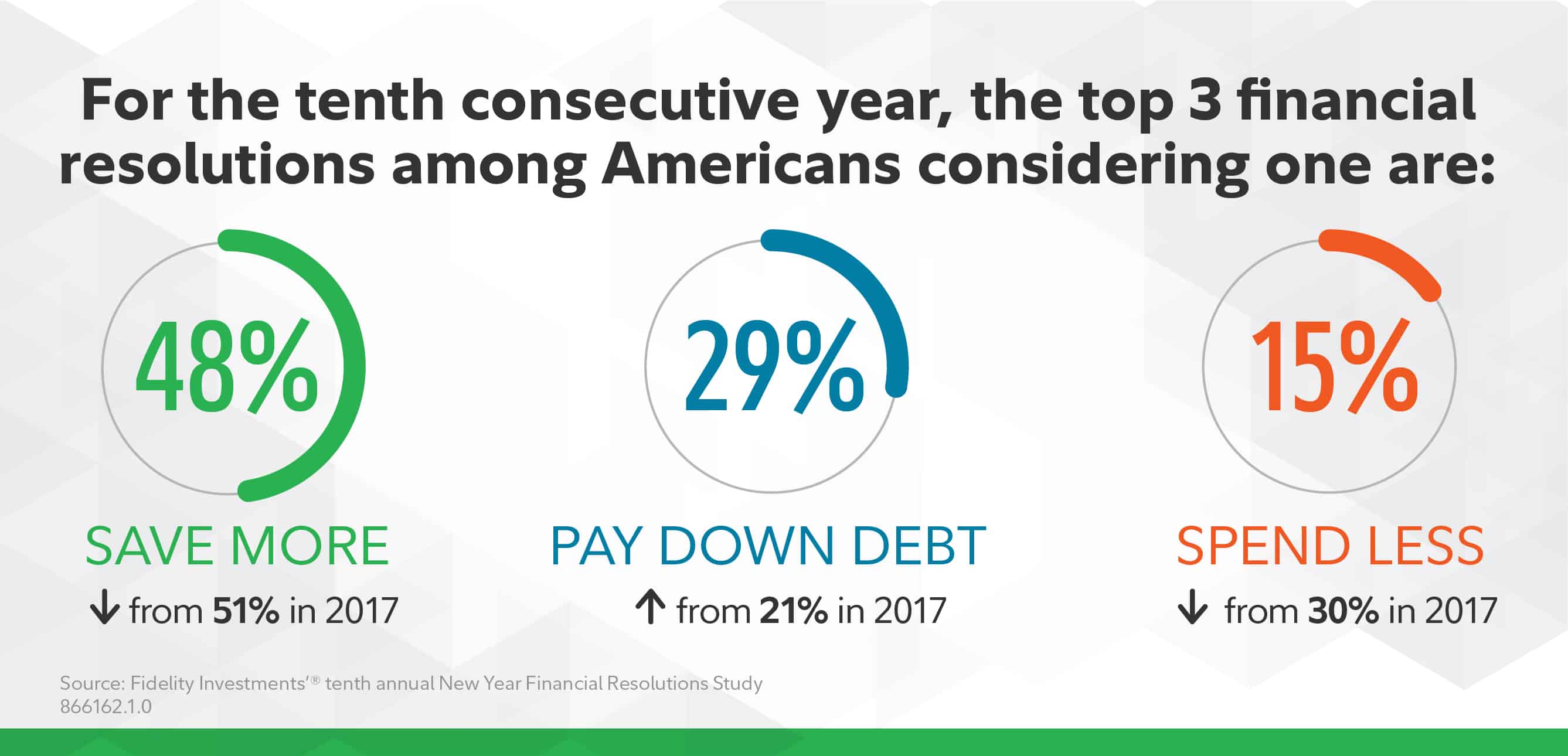 For the 10th year in a row, the most popular money promises include saving more, followed by paying down debt and spending less. Fidelity polled more than 2,000 adults in October.
