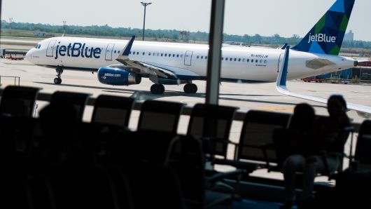 The low-cost airline is scheduled to hold an “all hands” meeting with staff at New York’s John F. Kennedy International Airport along with “viewing parties” at some of its main hubs around the U.S. on Wednesday afternoon, according to a company invitation obtained by CNBC. A save-the-date email announcing the April 10 event featured a background pattern similar to upholstery on London’s subway. Buttons featuring JetBlue’s logo and iconic London sights of Big Ben and the London Eye were sent to JetBlue offices, according to one employee.