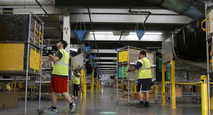 “They weigh a lot,” Amazon worker Amanda Taillon said during the pre-Christmas rush at a company warehouse in Connecticut. Nearby, a fleet of 6-foot-tall roving robot shelves zipped around behind a chain-link fence.