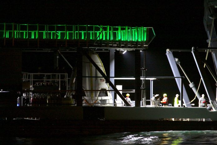 SpaceX’s Crew Dragon recovery vessel, named “Go Searcher,” hoisted the capsule out of the Atlantic and secured it on a fixture for the trip back to Port Canaveral.