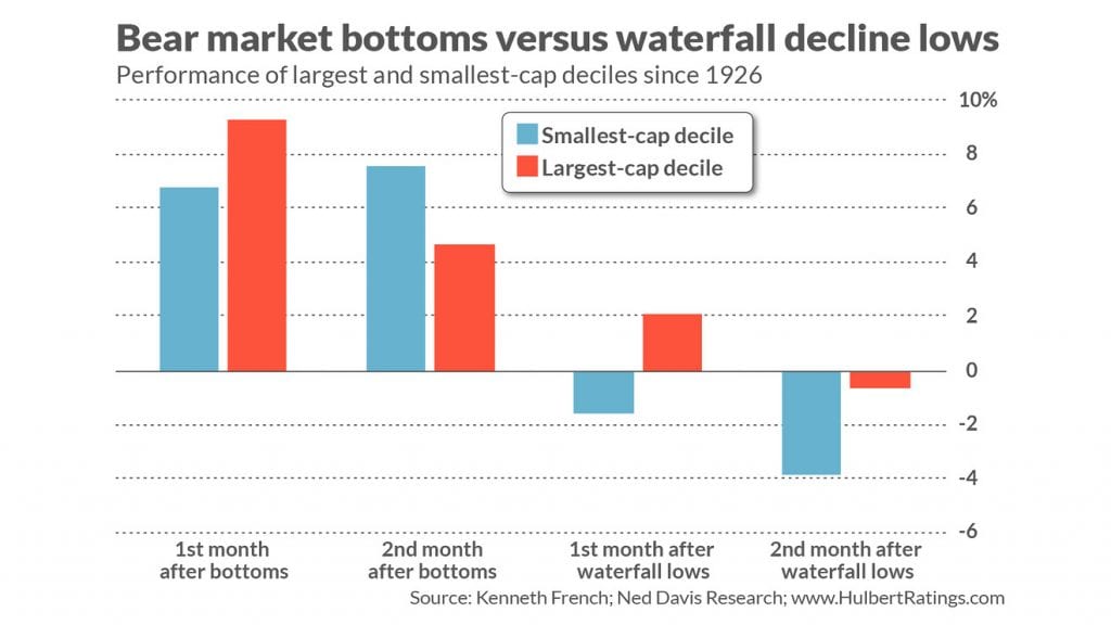 I next compared the returns of two portfolios in the first and second months following the lows of those waterfall declines. The first portfolio contained the 10% of stocks with the largest market caps, while the second contained the smallest-cap decile. (I relied on data from Dartmouth University professor Ken French.) On average, as you can see from the chart below, the smallest stocks lagged the largest over both months following waterfall lows.