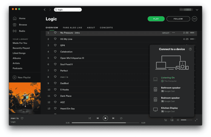 The news comes via Spotify Rock Star MattSuda — as they note, you’ll find the feature in desktop app version 1.1.38. In this version, you can simply use the usual “devices available” menu to see available Chromecast devices.
