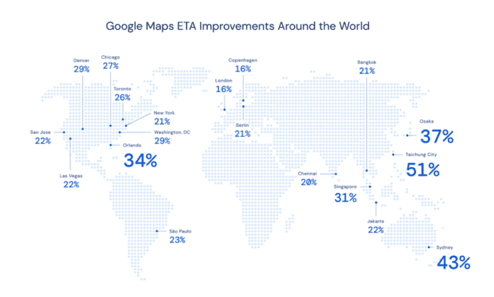The coordinated efforts have boosted the accuracy of real-time ETAs by up to 50 percent in cities such as Berlin, Jakarta, São Paulo, Sydney, Tokyo and Washington DC.