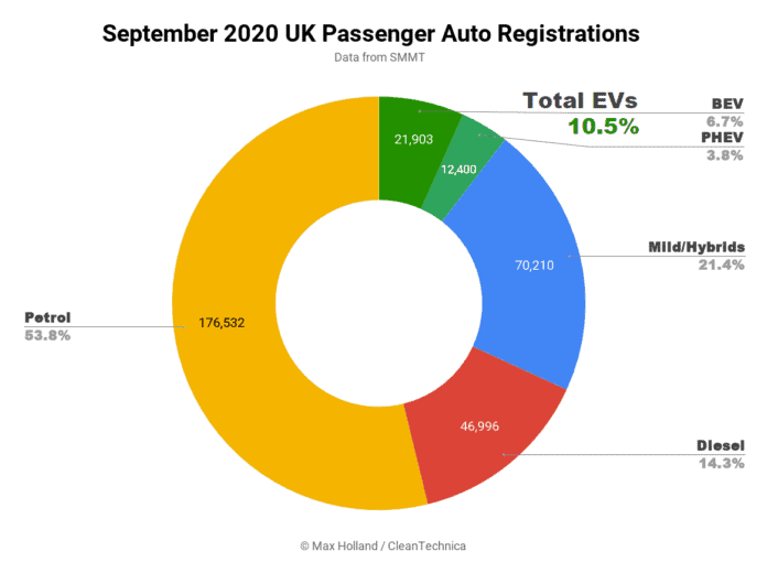 The UK’s September plugin electric vehicle market share hit 10.5%, the highest ever level in “normal” (non-lockdown) trading months, up almost 3x from September 2019’s 3.7%. The overall auto market was down just 4.4% from September 2019, with diesels taking a massive 38.4% hit.