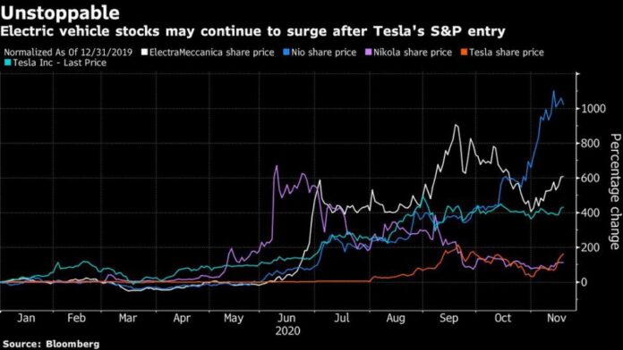 Shares of Nio Inc., Workhorse Group Inc., Lordstown Motors Corp. and Electrameccanica Vehicles Corp. also jumped sharply this week following Tesla’s S&P entry. Lordstown has risen 28% since the announcement, followed by a 17% increase in Workhorse and a 15% advance in Electrameccanica shares. Those gains added to red-hot rallies in recent months that were fueled in part by China’s renewed focus on building its battery-driven vehicle industry — a development that has only further convinced many that the global car market will be dominated by electric cars in decades ahead.