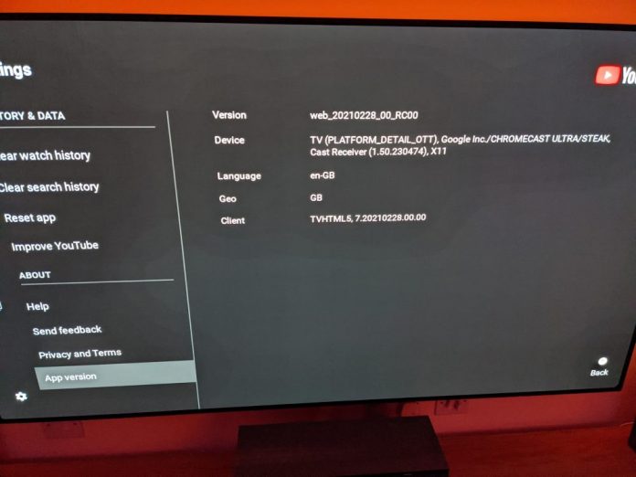 At least two users so far have encountered this YouTube for Chromecast app, with u/garethonreddit managing to capture a settings screen on the Chromecast Ultra. We learn from the “Version” number that this is a “web” experience, while “Client” notes how it is HTML5 powered. Users are able to clear watch and search history, as well as “Reset app.”