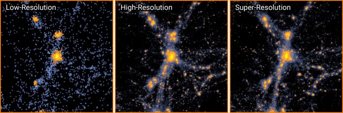 The new method developed by Li and his colleagues feeds a machine learning algorithm with models of a small region of space at both low and high resolutions. The algorithm learns how to upscale the low-res models to match the detail found in the high-res versions. Once trained, the code can take full-scale low-res models and generate ‘super-resolution’ simulations containing up to 512 times as many particles.
