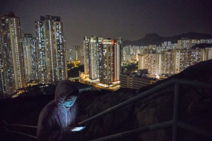 A man wearing a protective mask is illuminated by a smartphone as residential buildings stand in the background at night in Hong Kong, China, on Thursday, Feb. 20, 2020. Apartment rents in Hong Kong have dropped to the lowest in almost two years as people leave the city and home owners try to lease rather than sell. Photographer: Billy H.C. Kwok/Bloomberg via Getty Images