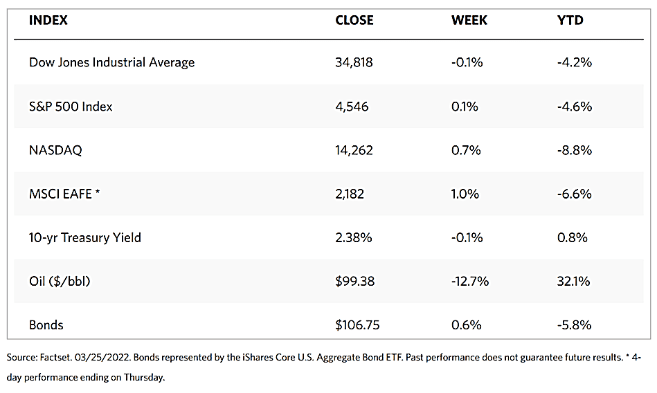 The past week’s volatility in stock prices was largely attributed to the fast-changing events in the Russian-Ukrainian war. Market performance was strong early in the week in response to reports that Russia was amenable to allowing Ukraine to join the European Union in return for a promise to stay out of NATO and the continuance of ceasefire talks. The four consecutive days of gains in the S&P 500 were only broken midweek when a Russian official stated no breakthroughs were foreseen in the talks with Ukraine and that Russia was regrouping its forces to complete the takeover of the eastern Donbas region. Sentiments turned more negative by Thursday when Ukrainian President Volodomyr Zelenskyy announced that Ukrainian forces are preparing for renewed Russian offensives.