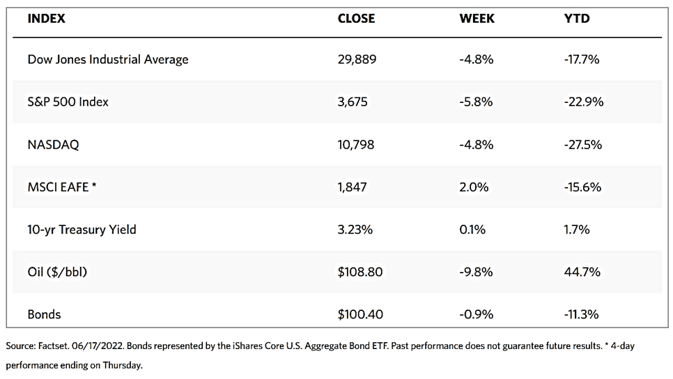 Stocks ended sharply lower for the second consecutive week on fears that the economy will experience a hard landing due to the Federal Reserve’s most aggressive rate hike since 1994. The week began with a sell-off that left every stock in the S&P 500 down at one point, a phenomenon that has not happened since 1996. Analysts attributed this to continuing inflation worries that were sparked the preceding Friday by a surprise increase in the May consumer inflation data. It was further worsened by a report on Monday by the Wall Street Journal that Fed officials were mulling an increase in interest rates by 75 basis points (or 0.75%) on the coming Wednesday meeting, something the market priced in the week earlier as having only a 2% chance of happening.