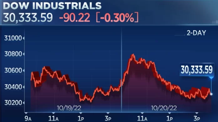 The Dow Jones Industrial Average slipped 90.22 points, or 0.30%, to 30,333.59. The S&P 500 fell 0.80% to 3,665.78. The Nasdaq Composite shed 0.61% to close at 10,614.84. The Dow was up nearly 400 points at session highs, but stocks faded as Treasury yields rose.