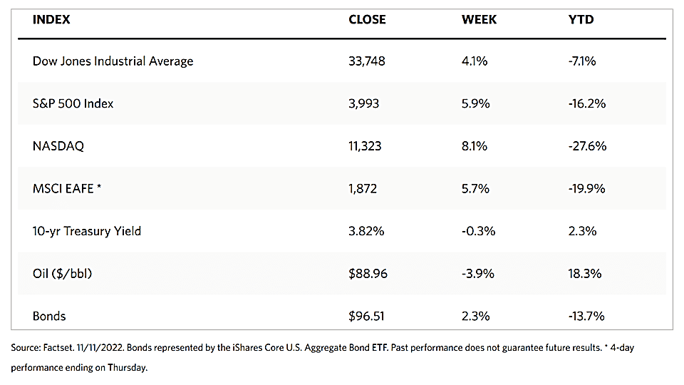 Investors heaved a sigh of relief at the cooler-than-expected inflation data released this week. Although this in no way guarantees that the worst is over, the market is hopeful that October could be the start of a disinflationary trend that could hopefully spill over to next year. The lower-than-expected headline consumer price index (CPI) sent stocks surging, Treasury yields declining, and a weakening in the dollar. The market reactions point to inflation as the top driver of market movements for the year, and a significant factor for consideration for Federal Reserve policy and investment strategy. There was heightened activity in the investment-grade corporate bond primary market even as the broad tax-exempt bond market traded higher.