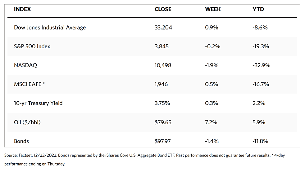 As U.S. oil inventories came in well below consensus expectations, energy stocks outperformed other sectors. Underperforming all sectors were consumer discretionary shares, plummeting as a result of a steep decline in Tesla following that company’s announcement of increased price discounts. On Thursday, chipmaker Micron Technology reported falling global demand, triggering a sell-down of semiconductor stocks. Bond trading ended early on Friday. Next week’s trading week will be shortened as both the equity and bond markets will be closed on Monday in observance of the Christmas holiday.