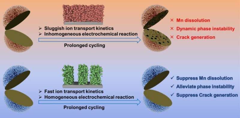 “The low-tortuosity structure enables LMO electrodes’ fast lithium-ion diffusion and small concentration polarization, leading to uniform electrochemical reaction within micro-regions of the electrodes. Furthermore, the fast lithium-ion transport kinetics and even mesoscopic-scale reactions of low-tortuosity LMO electrode effectively alleviate irreversible phase transition and Mn dissolution as well as suppress cracks generation in LMO particles,” Xie said.
