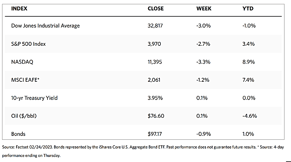 The week’s major stock indexes were rocked to a major correction as a slew of upside inflation and growth reports that broke expectations were released. The broad S&P 500 Index plunged 2.67%, its worst weekly loss since early December. At its close on Friday, this index gave up approximately 35% of the rally that began in October, but at its present level, it is still 3.40% up for the year to date. The narrowly-focused Dow Jones Industrial Average fell by 2.99% and has moved into negative territory for 2023, while the total stock market index corrected by 2.72%. The Nasdaq Stock Market Composite lost even more, giving up 3.33% for the week. This is consistent with communication services and consumer discretionary stocks underperforming other sectors, although the declines were widespread, and growth stocks were only slightly behind value shares. The NYSE Composite is down by 2.37%, while the risk perception monitor (the so-called “fear index”), the CBOE Volatility indicator, is up substantially by 8.24%, although it remains slightly below its mid-December levels.