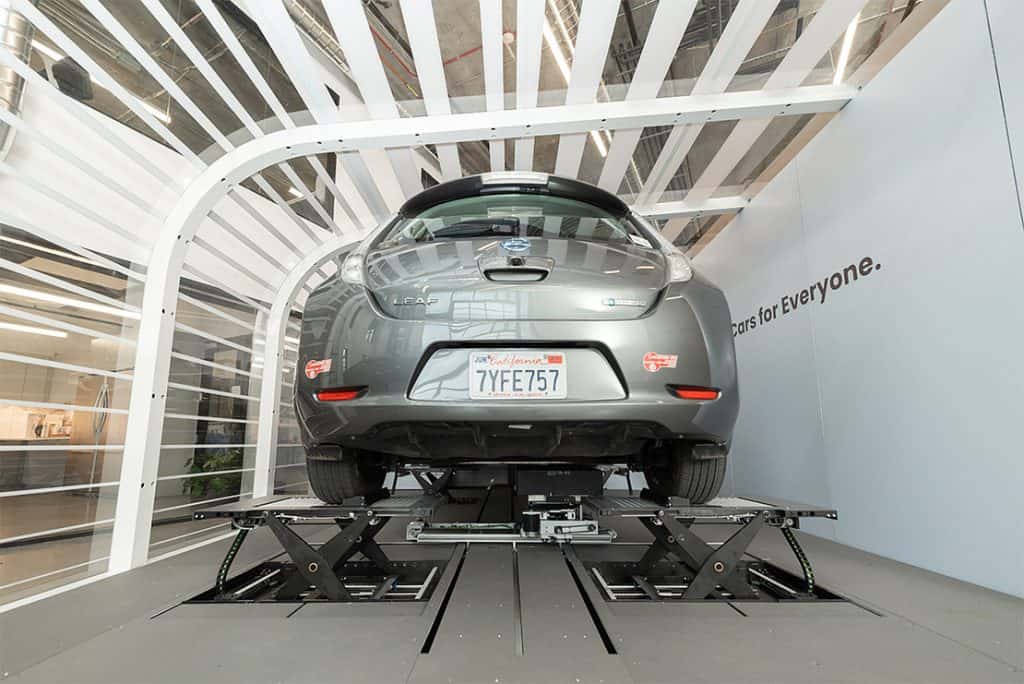 A Nissan Leaf parks at a battery-swapping station operated by Ample. Ample