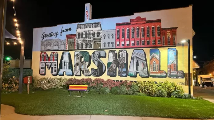 MARSHALL, MICH. – On a gusty morning in a quaint central Michigan town, the sun’s glow hits the brightly colored mural on the side of a brick building. It reads, in bold letters, “GREETINGS FROM MARSHALL.”