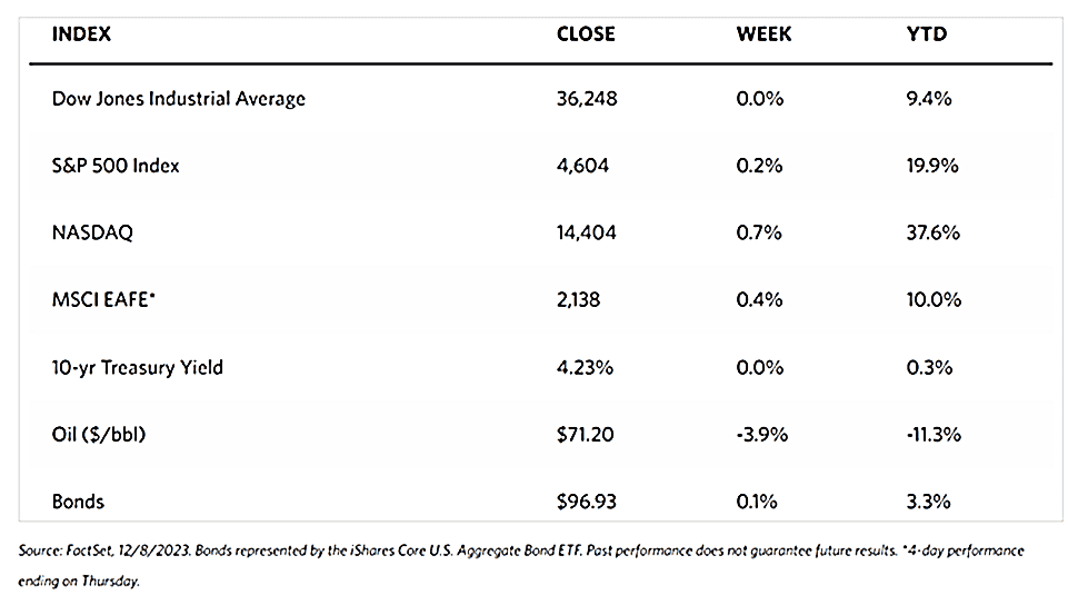 The week began with a sell-off but a late rally helped the major indexes close flat to modestly higher. For the third time in the past four weeks, the small-cap Russell 2000 Index outperformed the S&P 500 Index which resulted in narrowing its significant year-to-date underperformance. Growth stocks have built slightly over their value counterparts, and energy stocks lagged within the S&P 500 due to oil prices falling below the $70-per-barrel level for the first time since June. One factor that seemed to boost the growth indexes and the technology-heavy Nasdaq Composite is the continuing enthusiasm of the market over the potential of generative artificial intelligence (AI). On Thursday, Alphabet, Google’s mother company, rose by more than 5% after the company divulged its new AI model, Gemini. This product can process text, code, audio, images, and video, and can be incorporated into mobile applications. Simultaneously, Advanced Micro Devices climbed by almost 10% upon announcing its launch of a new generation of AI chips, Earlier in the week, Apple moved back to near its summer all-time highs when it eclipsed $3 trillion in market capitalization.