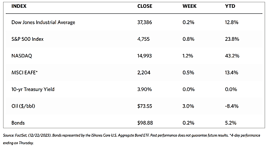 The pan-European STOXX Europe 600 Index inched up 0.21% higher this week in local currency terms and remained near its almost one-year high. Some major continental stocks showed softness while others moved sideways in listless trading on thin volumes just before the Christmas holidays. France’s CAC 50 Index declined by 0.37%, Germany’s DAX ticked down by 0.27%, and Italy’s FTSE MIB was modestly down, The UK’s FTSE 100 Index rose by 1.60%. UK’s inflation slowed more than expected, from 4.8% in October year-on-year to 3.9% in November year-on-year. The unexpected drop was due to a fall in prices for food, motor fuels, recreation, and culture. Core and services inflation showed that underlying price pressures eased, coming in at 5.1% and 6.3%, respectively. All inflation metrics remain well above the 2% inflation target set by the Bank of England (BoE). Revisions by the Office for National Statistics to the Gross Domestic Product (GDP) indicate that the economy performed worse than previously thought in certain quarters. In the April to June period, the GDP was lowered from 0.2% to flat, while the estimate for the third quarter indicated that the economy shrank by 0.1%. Despite lower inflation figures, the BoE stated that interest rates are likely to remain at elevated levels, according to BoE Deputy Gov. Ben Broadbent.