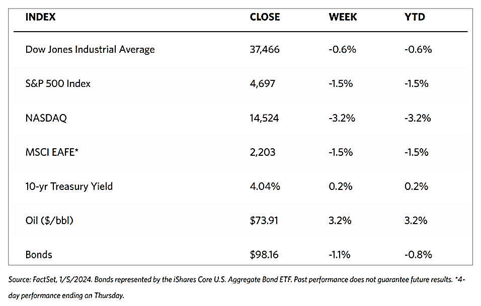The moderate sell-off can be attributed to some repositioning that was bound to happen at the start of a new trading year. After all, the markets rallied by 16% during the last two months of 2023 and some profit-taking can only be expected. The new year’s performance may be significantly affected by two primary forces: the interest-rate decisions that the Federal Reserve will be making and the economy’s glide path, both of which ought to be favorable this year. There is some vulnerability, however, in possible surprises on the downside compared to the rosy expectations (referred to as the Goldilocks outcomes, neither too hot nor too cold) for 2024, thus some volatility is likely.