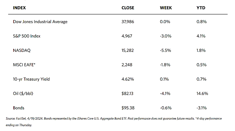 This is the third consecutive week of broad losses as concerns continue to mount over tensions in the Middle East. Furthermore, fears that interest rates may remain “higher for longer” continue to weigh on investor sentiments. As rising rates placed a higher theoretical discount on future earnings, mega-cap technology shares lagged, as the plunge by the Nasdaq this week showed. Advanced chipmaker supplier ASML Holdings missed its first-quarter revenue target, and this fact appears to weigh on the sector and general optimism toward companies with artificial intelligence (AI)-related earnings.