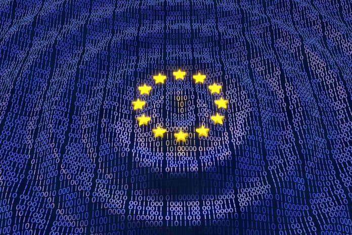 European Union Data Protection bits and bytes in ripple waving pattern with glowing EU stars