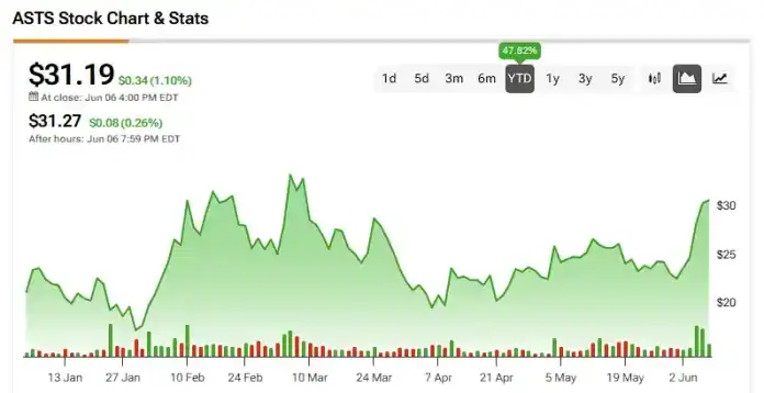 The market for satellite internet is projected to grow rapidly, with analysts estimating it could reach $24.6 billion by 2030, representing a compound annual growth rate of 30%. ASTS stock is following this trend, recording a surging 14% gain over the past week and a 47% gain year-to-date.