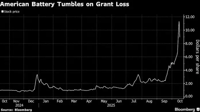 A battery-metals recycler that saw a 1,000% jump in its stock price in a year plummeted after a key US government grant was canceled.