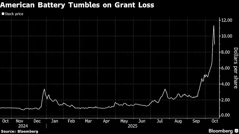 American Battery Technology Co. fell as much as 25% in pre-market trading on Thursday morning after the company said in a filing Wednesday that the US Department of Energy terminated a previously awarded grant. Shares slid as much as 28% on Wednesday.
