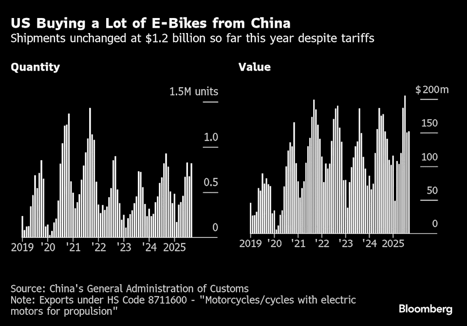 While almost all the top 10 exports to the US slumped last quarter from a year earlier, shipments of e-cigarettes rose, according to a Bloomberg analysis of China’s customs data. E-bikes are also seeing strong US demand, with Chinese firms exporting more than $500 million worth in the three months through September, slightly up on a year earlier.