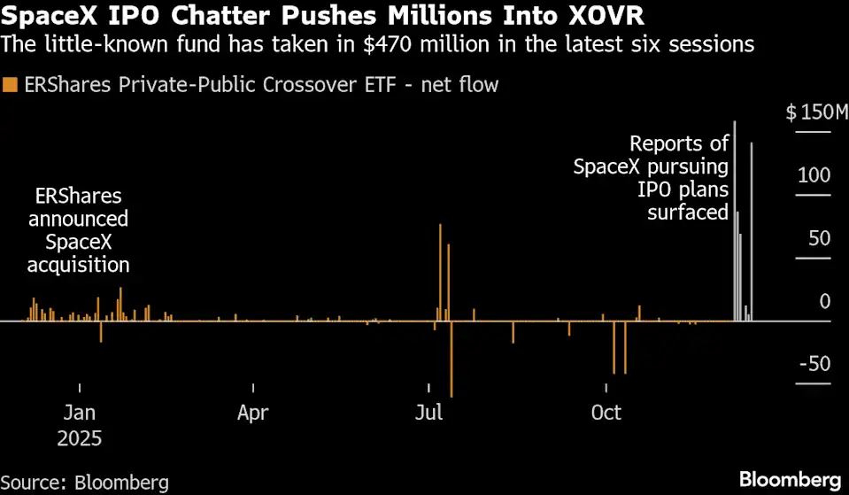 The ERShares Private-Public Crossover ETF (ticker XOVR) has taken in more than $470 million since Dec. 8 — more than half its total assets — as investors seek to get in on what could become the biggest initial public offering ever.