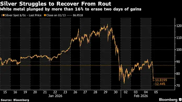 Spot silver plunged as much as 17% on Thursday, having flickered briefly above $90 an ounce in early Asian trading. After a record-breaking rally that appeared to run too far, too fast, the metal has retreated by more than a third from an all-time high hit on Jan. 29.